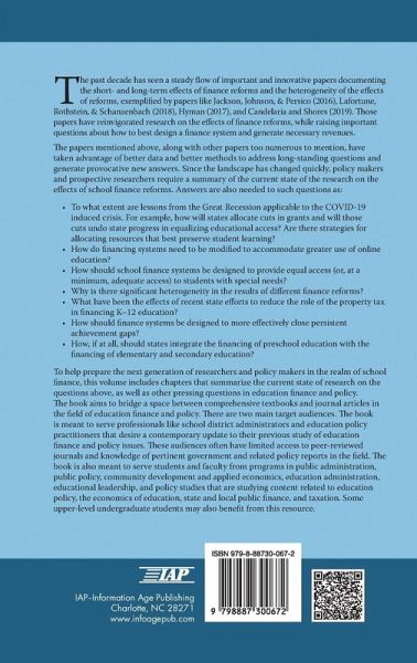 The past decade has seen a steady flow of important and innovative papers documenting the short- and long-term effects of finance reforms and the heterogeneity of the effects of reforms, exemplified by papers like Jackson, Johnson, & Persico (2016), Lafortune, Rothstein, & Schanzenbach (2018), Hyman (2017), and Candelaria and Shores (2019). Those papers have reinvigorated research on the effects of finance reforms, while raising important questions about how to best design a finance system and generate necessary revenues. The papers mentioned above, along with other papers too numerous to mention, have taken advantage of better data and better methods to address long-standing questions and generate provocative new answers. Since the landscape has changed quickly, policy makers and prospective researchers require a summary of the current state of the research on the effects of school finance reforms. To help prepare the next generation of researchers and policy makers in the realm of school finance, this volume includes papers that summarize the current state of research on the questions above, as well as other pressing questions in education finance and policy. The book aims to bridge a space between comprehensive textbooks and journal articles in the field of education finance and policy. There are two main target audiences. The book is meant to serve professionals like school district administrators and education policy practitioners that desire a contemporary update to their previous study of education finance and policy issues. These audiences often have limited access to peer reviewed journals and knowledge of pertinent government and related policy reports in the field. The book is also meant to serve students and faculty from programs in public administration, public policy, community development and applied economics, education administration, educational leadership and policy studies that are studying content related to education policy, the economics of education, state and local public finance, and taxation. Some upper-level undergraduate students may also benefit from this resource.