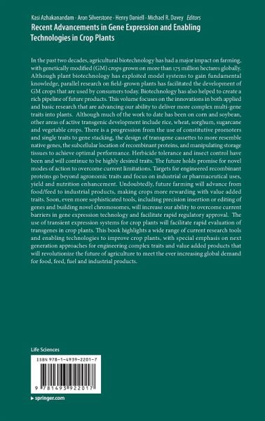 In this book, authors who are experts in their fields describe current advances on commercial crops and key enabling technologies that will underpin future advances in biotechnology. They discuss state of the art discoveries as well as future challenges. Tremendous progress has been made in introducing novel genes and traits into plant genomes since the first creation of transgenic plants thirty years ago, and the first commercialization of genetically modified maize in 1996. Consequently, cultivation of biotech crops with useful traits has increased more than 100-fold from 1.7 million hectares in 1996 to over 175 million hectares globally in 2013. This achievement has been made possible by continued advances in understanding the basic molecular biology of regulatory sequences to modulate gene expression, enhancement of protein synthesis and new technologies for transformation of crop plants.