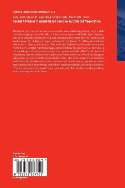 This bookcovers recent advances in Complex Automated Negotiations as a widely studiedemerging area in the field of Autonomous Agents and Multi-Agent Systems. The book includes selectedrevised and extended papers from the 7th International Workshop on Agent-Based ComplexAutomated Negotiation (ACAN2014), which was held in Paris, France, in May2014. The book also includes brief introductions aboutAgent-based Complex Automated Negotiation which are based on tutorials providedin the workshop, and brief summaries and descriptions about the ANAC'14 (AutomatedNegotiating Agents Competition) competition, where authors of selectedfinalist agents explain the strategies and the ideas used by them. Thebook is targeted to academic and industrial researchers in various communitiesof autonomous agents and multi-agent systems, such as agreement technology,mechanism design, electronic commerce, related areas, as well as graduate,undergraduate, and PhD students working in those areas or having interest inthem.