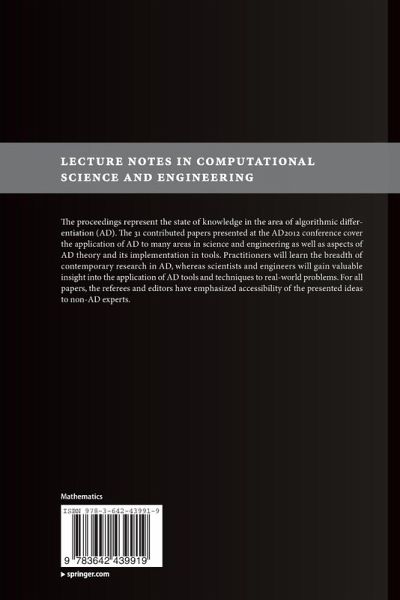 The proceedings represent the state of knowledge in the area of algorithmic differentiation (AD). The 31 contributed papers presented at the AD2012 conference cover the application of AD to many areas in science and engineering as well as aspects of AD theory and its implementation in tools. For all papers the referees, selected from the program committee and the greater community, as well as the editors have emphasized accessibility of the presented ideas also to non-AD experts. In the AD tools arena new implementations are introduced covering, for example, Java and graphical modeling environments or join the set of existing tools for Fortran. New developments in AD algorithms target the efficiency of matrix-operation derivatives, detection and exploitation of sparsity, partial separability, the treatment of nonsmooth functions, and other high-level mathematical aspects of the numerical computations to be differentiated. Applications stem from the Earth sciences, nuclear engineering, fluid dynamics, and chemistry, to name just a few. In many cases the applications in a given area of science or engineering share characteristics that require specific approaches to enable AD capabilities or provide an opportunity for efficiency gains in the derivative computation. The description of these characteristics and of the techniques for successfully using AD should make the proceedings a valuable source of information for users of AD tools.