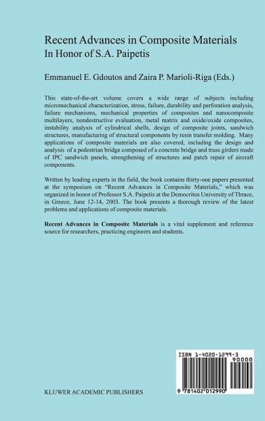 This book contains 31 papers presented at the symposium on "Recent Advances in Composite Materials" which was organized in honor of Professor Stephanos A. Paipetis. The symposium took place at Democritus University of Thrace, in Xanthi, Greece on June 12-14, 2003. The book is a tribute to Stephanos A. Paipetis, a pioneer of composite materials, in recognition of his continuous, original diversified and outstanding contributions for half a century. The book consists of invited papers written by leading experts in the field. It contains original contributions concerning the latest developments in composite materials. It covers a wide range of subjects including experimental characterization, analytical modeling and applications of composite materials. The papers are arranged in the following six sections: General concepts, stress and failure analysis, mechanical properties, metal matrix composites, structural analysis and applications of composite materials. The first section on general concepts contains seven papers dealing with composites through the pursuit of the consilience among them, computation and mechatronic automation of multiphysics research, a theory of anisotropic scattering, wave propagation, multi-material composite wedges, a three-dimensional finite element analysis around broken fibers and an in situ assessment of the micromechanics of large scale bridging in ceramic composites.