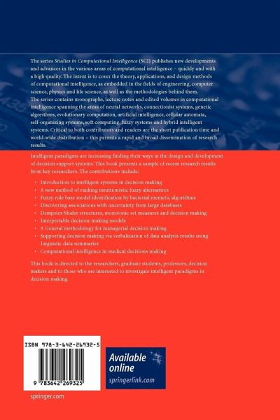 Intelligent paradigms are increasingly finding their ways in the design and development of decision support systems. This book presents a sample of recent research results from key researchers. The contributions include: Introduction to intelligent systems in decision making - A new method of ranking intuitionistic fuzzy alternatives - Fuzzy rule base model identification by bacterial memetic algorithms - Discovering associations with uncertainty from large databases - Dempster-Shafer structures, monotonic set measures and decision making - Interpretable decision-making models - A general methodology for managerial decision making - Supporting decision making via verbalization of data analysis results using linguistic data summaries - Computational intelligence in medical decisions making.