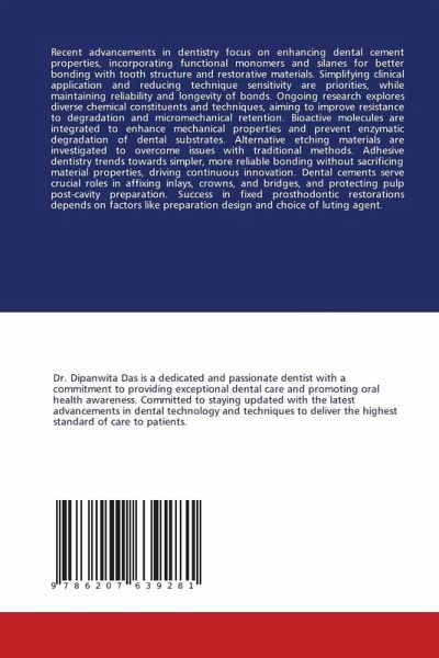 Recent advancements in dentistry focus on enhancing dental cement properties, incorporating functional monomers and silanes for better bonding with tooth structure and restorative materials. Simplifying clinical application and reducing technique sensitivity are priorities, while maintaining reliability and longevity of bonds. Ongoing research explores diverse chemical constituents and techniques, aiming to improve resistance to degradation and micromechanical retention. Bioactive molecules are integrated to enhance mechanical properties and prevent enzymatic degradation of dental substrates. Alternative etching materials are investigated to overcome issues with traditional methods. Adhesive dentistry trends towards simpler, more reliable bonding without sacrificing material properties, driving continuous innovation. Dental cements serve crucial roles in affixing inlays, crowns, and bridges, and protecting pulp post-cavity preparation. Success in fixed prosthodontic restorations depends on factors like preparation design and choice of luting agent.