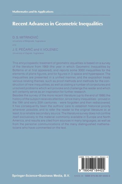 The Existence of a Triangle.- Duality between Geometric Inequalities and Inequalities for Positive Numbers.- Homogeneous Symmetric Polynomial Geometric Inequalities.- Duality between Different Triangle Inequalities and Triangle Inequalities with (R, r, s).- Transformations for the Angles of a Triangle.- Some Trigonometric Inequalities.- Some Other Transformations.- Convex Functions and Geometric Inequalities.- Miscellaneous Inequalities with Elements of a Triangle.- Special Triangles.- Triangle and Point.- Inequalities with Several Triangles.- The M¿bius-Neuberg and the M¿bius-Pompeiu Theorems.- Inequalities for Quadrilaterals.- Inequalities for Polygons.- Inequalities for a Circle.- Particular Inequalities in Plane Geometry.- Inequalities for Simplexes in En (n ? 2).- Inequalities for Tetrahedra.- Other Inequalities in En (n ? 2).