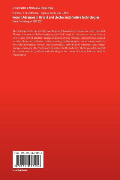 This book presents the select proceedings of International Conference on Hybrid and Electric Automotive Technologies 2021 (HEAT 2021). It cover recent innovations in electric and hybrid-electric vehicles and autonomous vehicles. Various topics covered in this volume are batteries, battery cooling methodologies, use of nano-coolants, electrified powertrain systems and components, hybridisation infrastructure, energy storage, and many other topics of importance to the industry. The book will be useful for researchers and professionals working in the areas of automobile and vehicle engineering.