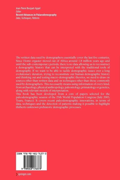 Jean-Pierre BOCQUET-APPEL CNRS, Paris, France The written data used by demographers essentially cover the last five centuries. Since Homo ergaster moved out of Africa around 1. 8 million years ago and until the sub-contemporary periods, there is no data allowing us to reconstruct a demographic history that can be interpreted with the traditional tools of demography. If we want to be able to tackle demographic issues over a long evolutionary duration, trying to reconstitute our human demographic history and thinking out and testing macro-demographic theories, we need to draw on sources other than written data and on techniques other than those commonly used by demographers. This necessarily means using inf- mation of every kind, from archaeology, physical anthropology, pale- tology, primatology or genetics, along with relevant models of interpretation. The volume presented here has been developed from a core of papers selected for the paleodemographic session of the 25th World Population Congress (July 2005, Tours, France), to which further requested contri- tions have been added. The publication covers recent paleodemographic innovations, in terms of data, techniques and the detection of patterns making it possible to highlight hitherto unknown prehistoric demographic processes. Now that the anxiety over ways of defusing the population "time bomb", which mobilized mainstream demographic thinking as from the 1960s (see, for authority, Bogue and Tsui 1979; Demeny 1979) has largely been dis- pated, the focus has shifted to other important issues.