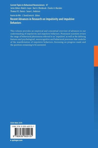Overview chapter.- Imaging studies linking dopaminergic systems to impulsivity in humans.- The Genetics of Externalizing Problems.- The neuropharmacology of impulsive behaviour: ten years later.- Inhibitory control and impulsivity in childhood onset disruptive behavior disorders.- Steep discounting of future rewards as an impulsivity phenotype: a concise review.- Developmental considerations in impulsivity: Implications for research and treatment.- Reinforcer Pathology: Implications for Substance Abuse Intervention.- Impulsivity and Suicidal Behavior.- Sex differences in neural circuits underlying inhibitory control.- The role of impulsivity facets on the incidence and development of alcohol use disorders.- The neurobiology of reinforcement learning mechanisms in impulsivity.