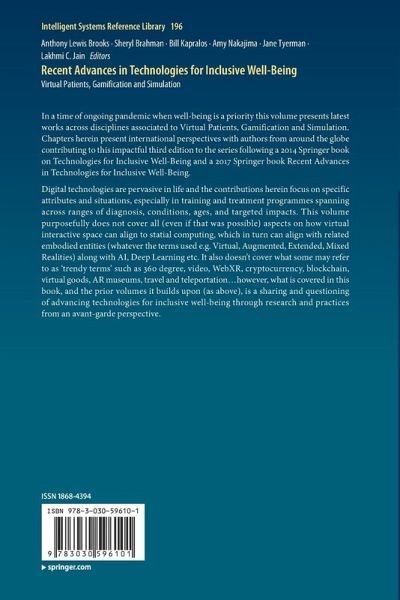 In a time of ongoing pandemic when well-being is a priority this volume presents latest works across disciplines associated to Virtual Patients, Gamification and Simulation. Chapters herein present international perspectives with authors from around the globe contributing to this impactful third edition to the series following a 2014 Springer book on Technologies for Inclusive Well-Being and a 2017 Springer book Recent Advances in Technologies for Inclusive Well-Being.