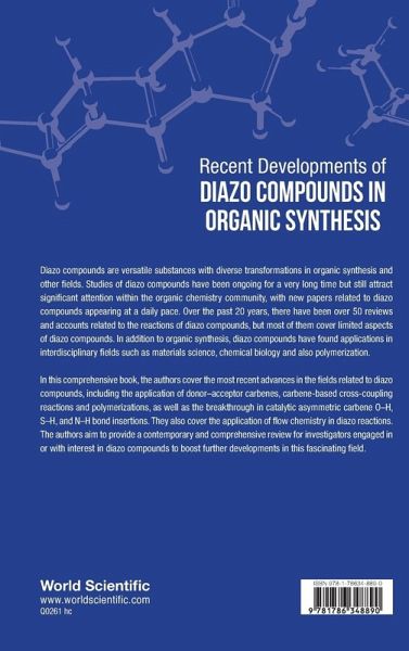 Diazo compounds are versatile substances with diverse transformations in organic synthesis and other fields. Studies of diazo compounds have been ongoing for a very long time but still attract significant attention within the organic chemistry community, with new papers related to diazo compounds appearing at a daily pace. Over the past twenty years, there have been over fifty reviews and accounts related to the reactions of diazo compounds, but most of them cover limited aspects of diazo compounds. In addition to organic synthesis, diazo compounds have found applications in interdisciplinary fields such as material sciences, chemical biology and also polymerization. In this comprehensive book, the authors cover the most recent advances in the fields related to diazo compounds, including the application of donor-acceptor carbenes, carbene-based cross-coupling reactions and polymerizations, as well as the breakthrough in catalytic asymmetric carbene O-H, S-H, and N-H bond insertions. They also cover the application of flow chemistry in diazo reactions. The authors aim to provide a contemporary and comprehensive review for investigators engaged in or with interest in diazo compounds to boost further developments in this fascinating field.