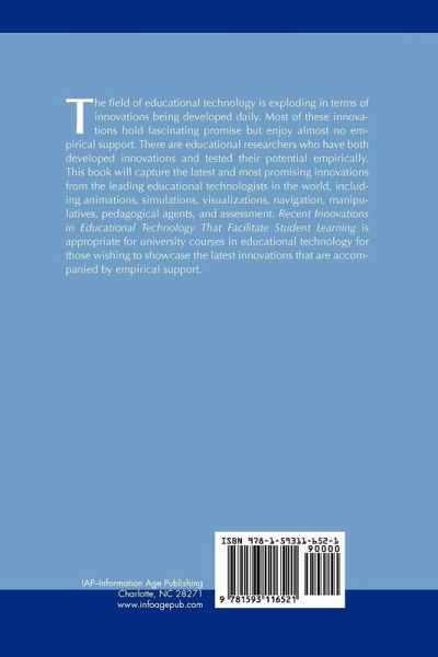 A volume in Current Perspectives on Cognition, Learning, and Instruction Series Editors Daniel H. Robinson, University of Texas and Gregory Schraw, University of Nevada at Las Vegas Founding Editor James M. Royer, University of Massachusetts The field of educational technology is exploding in terms of innovations being developed daily. Most of these innovations hold fascinating promise but enjoy almost no empirical support. There are educational researchers who have both developed innovations and tested their potential empirically. This book will capture the latest and most promising innovations from the leading educational technologists in the world, including animations, simulations, visualizations, navigation, manipulatives, pedagogical agents, and assessment. This book is appropriate for university courses in educational technology for those wishing to showcase the latest innovations that are accompanied by empirical support.
