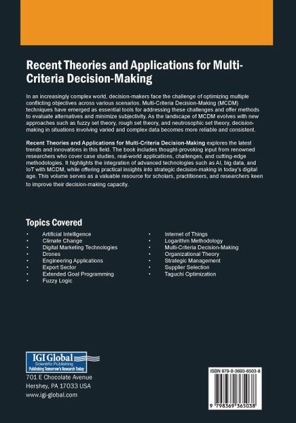 In an increasingly complex world, decision-makers face the challenge of optimizing multiple conflicting objectives across various scenarios. Multi-Criteria Decision-Making (MCDM) techniques have emerged as essential tools for addressing these challenges and offer methods to evaluate alternatives and minimize subjectivity. As the landscape of MCDM evolves with new approaches such as fuzzy set theory, rough set theory, and neutrosophic set theory, decision-making in situations involving varied and complex data becomes more reliable and consistent. Recent Theories and Applications for Multi-Criteria Decision-Making explores the latest trends and innovations in this field. The book includes thought-provoking input from renowned researchers who cover case studies, real-world applications, challenges, and cutting-edge methodologies. It highlights the integration of advanced technologies such as AI, big data, and IoT with MCDM, while offering practical insights into strategic decision-making in today's digital age. This volume serves as a valuable resource for scholars, practitioners, and researchers keen to improve their decision-making capacity.