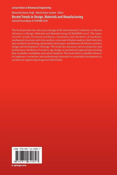 The book presents the select proceedings of the International Conference on Recent Advances in Design, Materials and Manufacturing (ICRADMM 2020). The topics covered include structural mechanics, kinematics and dynamics of machines, mechanical structures and stress analysis, noise and vibration analysis, fault detection and condition monitoring, optimization techniques, mechatronics & robotics, product design and development, tribology. The book also discusses various properties and performance attributes of modern-age design in mechanical engineering including their durability, workability,…mehr