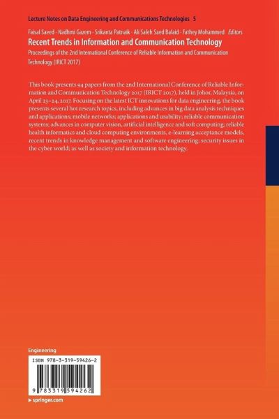 This book presents 94 papers from the 2nd International Conference of Reliable Information and Communication Technology 2017 (IRICT 2017), held in Johor, Malaysia, on April 23-24, 2017. Focusing on the latest ICT innovations for data engineering, the book presents several hot research topics, including advances in big data analysis techniques and applications; mobile networks; applications and usability; reliable communication systems; advances in computer vision, artificial intelligence and soft computing; reliable health informatics and cloud computing environments, e-learning acceptance models, recent trends in knowledge management and software engineering; security issues in the cyber world; as well as society and information technology.
