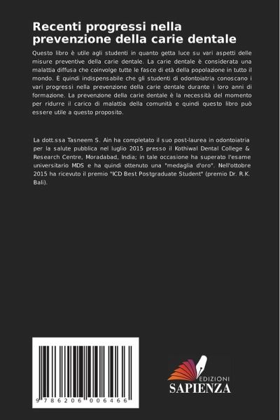 Questo libro è utile agli studenti in quanto getta luce su vari aspetti delle misure preventive della carie dentale. La carie dentale è considerata una malattia diffusa che coinvolge tutte le fasce di età della popolazione in tutto il mondo. È quindi indispensabile che gli studenti di odontoiatria conoscano i vari progressi nella prevenzione della carie dentale durante i loro anni di formazione. La prevenzione della carie dentale è la necessità del momento per ridurre il carico di malattia della comunità e quindi questo libro può essere utile a questo proposito.