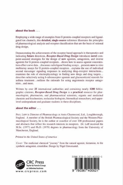 Employing a wide range of examples from G-protein-coupled receptors and ligand-gated ion channels, this detailed, single-source reference illustrates the principles of pharmacological analysis and receptor classification that are the basis of rational drug design. Explains the experimental and theoretical methods used to characterize interactions between ligands and receptors-providing the pharmacological information needed to solve treatment problems and facilitate the drug design process! Demonstrating the achievements of the receptor-based approach in therapeutics and indicating future directions, Receptor-Based Drug Design 1. introduces novel computer-assisted strategies for the design of new agonists, antagonists, and inverse agonists for G-protein-coupled receptors 2. shows how to assess agonist concentration-effect curve data 3. discusses radioligand binding assays 4. presents new in vitro multiarray assays for G-protein-coupled receptors 5. explains the use of individual second messenger signaling responses in analyzing drug-receptor interactions 6. examines the role of electrophysiology in finding new drugs and drug targets 7. describes selectively acting b-adrenoceptor agonists and glucocorticoid steroids for asthma treatment 8. outlines the rationale for using angiotensin receptor antagonists 9. and more! Written by over 25 international authorities and containing nearly 1200 bibliographic citations, Receptor-Based Drug Design is a practical resource for pharmacologists, pharmacists, and pharmaceutical scientists; organic and medicinal chemists and biochemists; molecular biologists; biomedical researchers; and upper-level undergraduate and graduate students in these disciplines.