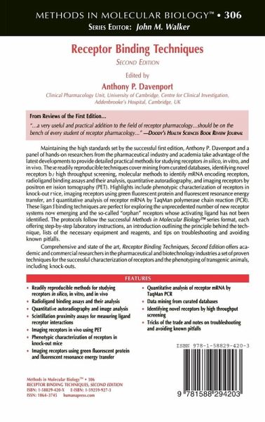 A comprehensive collection of readily reproducible methods for studying receptors in silico, in vitro, and in vivo. These cutting-edge techniques cover mining from curated databases, identifying novel receptors by high throughput screening, molecular methods to identify mRNA encoding receptors, radioligand binding assays and their analysis, quantitative autoradiography, and imaging receptors by positron emission tomography (PET). Highlights include phenotypic characterization of receptors in knockout mice, imaging receptors using green fluorescent protein and fluorescent resonance energy transfer, and quantitative analysis of receptor mRNA by TaqMan PCR. These book equips the researcher with techniques for exploring the unprecedented number of new receptor systems now emerging and the so-called 'orphan' receptors whose activating ligand has not been identified.