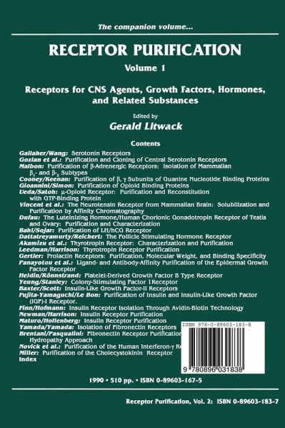 The purpose of these volumes is to provide a reference work for the methods of purifying many of the receptors we know about. This becomes increasingly important as full-length recep tors are overexpressed in bacteria or in insect cell systems. A major problem for abundantly expressed proteins will be their purification. In addition to purification protocols, many other de tails can be found concerning an individual receptor that may not be available in standard texts or monographs. No book of this type is available as a compendium of purification procedures. Receptor Purification provides protocols for the purification of a wide variety of receptors. These include receptors that bind: neurotransmitters, polypeptide hormones, steroid hormones, and ligands for related members of the steroid supergene family and others including receptors involved in bacterial motion. The text of this information is substantial so as to require its publica tion in two volumes. Consequently, a division was made by grouping receptors depending upon the nature of their ligands. Thus, in volume 1 there are contributions on serotonin receptors, adrenergic receptors, the purification of GTP-binding proteins, opioid receptors, neurotensin receptor, luteinizing hormone re ceptor, human chorionic gonadotropin receptor, follicle stimulat ing hormone receptor, thyrotropin receptor, prolactin receptor, epidermal growth factor receptor, platelet derived growth factor receptor, colony stimulating factor receptor, insulinlike growth factor receptors, insulin receptor, fibronectin receptor, interferon receptor, and the cholecystokinin receptor.