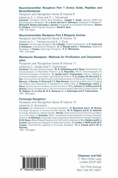 ROBERT J. LEFKOWITZ, M. D. Receptor Regulation (Receptors and Recognition, Series B, Volume 13) Edited by R. J. Lefkowitz Published in 1981 by Chapman and Hall, 11 New Fetter Lane, London EC4P 4EE © 1981 Chapman and Hall The study of hormone and drug receptors has become one of the most excit ing and rapidly moving areas of biomedical research. Elucidation of receptor mechanisms and receptor structure has become the common goal of many scientists from diverse backgrounds. The rapid advances achieved have been due, in large part, to the concentrated effort of workers from a variety of disciplines including classical pharmacology, biochemistry, endocrinology, cell biology, genetics' and molecular biology, among others. Hormone and drug receptors appear to be of three major types, which may be classified by their cellular locations. Found in the plasma membranes of cells are the receptors for a wide variety of polypeptide hormones, catecholamines and a variety of neurotransmitters. Included within this group are those receptors coupled to the enzyme adenylate cyclase. The second group of receptors are the soluble cytoplasmic receptors for the steroid hormones. A third type of hormone receptor is the receptor for the thyroid hormones which appears to be confined to the nucleus. Not only may these different types of receptor be distinguished in terms of their cellular locations but also by their mechanisms of action.