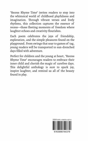 "Recess Rhyme Time" invites readers to step into the whimsical world of childhood playfulness and imagination. Through vibrant verses and lively rhythms, this collection captures the essence of recess-those fleeting moments of freedom where laughter echoes and creativity flourishes. Each poem celebrates the joys of friendship, exploration, and the simple pleasures found on the playground. From swings that soar to games of tag, young readers will be transported to sun-drenched days filled with adventure. Perfect for children and the young at heart, "Recess Rhyme Time" encourages readers to embrace their inner child and cherish the magic of carefree days. This delightful anthology is sure to spark joy, inspire laughter, and remind us all of the beauty found in play.