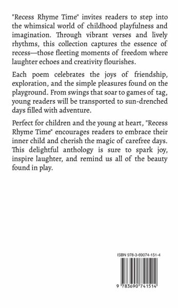 "Recess Rhyme Time" invites readers to step into the whimsical world of childhood playfulness and imagination. Through vibrant verses and lively rhythms, this collection captures the essence of recess-those fleeting moments of freedom where laughter echoes and creativity flourishes. Each poem celebrates the joys of friendship, exploration, and the simple pleasures found on the playground. From swings that soar to games of tag, young readers will be transported to sun-drenched days filled with adventure. Perfect for children and the young at heart, "Recess Rhyme Time" encourages readers to embrace their inner child and cherish the magic of carefree days. This delightful anthology is sure to spark joy, inspire laughter, and remind us all of the beauty found in play.
