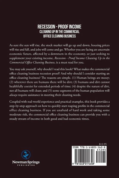 As sure the sun will rise, the stock market will go up and down, housing prices will rise and fall, and jobs will come and go. Whether you are facing an uncertain economic future, affected by a downturn in the economy, or just seeking to supplement your existing income, Recession Proof Income—Cleaning Up in the Commercial Office Cleaning Business, is a must read for you. You may ask yourself, why should I read this book? What makes the commercial office cleaning business recession proof? And why should I consider starting an office cleaning business? The reasons are simple. (1) Human beings are messy; (2) wherever there are humans there will be dirt; (3) humans and dirt cannot healthfully coexist for extended periods of time; (4) despite the nature of dirt, not all humans will clean; and (5) some segments of the human population will always require assistance in meeting their cleaning needs. Coupled with real-world experience and practical examples, this book provides a step-by-step approach on how to quickly start reaping profits in the commercial office cleaning business. If you are unafraid of hard work and taking some moderate risk, the commercial office cleaning business can provide you with a steady stream of income in both good and bad economic times.