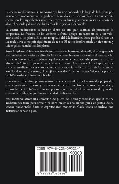 La cocina mediterránea es una cocina que ha sido conocida a lo largo de la historia por su rico patrimonio cultural, ingredientes saludables y deliciosos platos. La base de esta cocina son los ingredientes saludables como las frutas y verduras frescas, el aceite de oliva, el pescado y el marisco, las hierbas, las especias y los cereales. La cocina mediterránea se basa en el uso de una gran cantidad de productos de temporada. La frescura de las verduras y frutas agrega un sabor único y un valor nutricional a los platos. El clima templado del Mediterráneo hace posible el uso del aceite de oliva como principal fuente de aceite. El aceite de oliva añade un rico aroma y ácidos grasos saludables a los platos. Entre los platos típicos mediterráneos destacan el hummus, el tabulé, el baba ganoush, las alcachofas con aceite de oliva, las hojas rellenas, los aperitivos varios, el marisco y las ensaladas frescas. Además, platos populares como la pasta con salsa pesto, la paella, el pisto también forman parte de la cocina mediterránea. Una característica importante de la cocina mediterránea es el uso abundante de especias y hierbas. Las hierbas como el tomillo, el romero, la menta, el perejil y el eneldo añaden un aroma único a los platos y también son beneficiosas para la salud. La cocina mediterránea promueve una dieta sana y equilibrada. Las comidas preparadas con ingredientes frescos y naturales contienen muchas vitaminas, minerales y antioxidantes. También es conocido por su bajo contenido de grasas saturadas y su alto contenido de fibra, lo que favorece la salud cardiovascular. Este recetario ofrece una colección de platos deliciosos y saludables que la cocina mediterránea tiene para ofrecer. El libro presenta una amplia gama de platos, desde recetas tradicionales hasta interpretaciones modernas. Cada receta se incluye con instrucciones paso a paso.