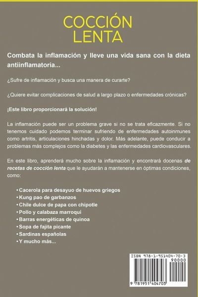 Combata la inflamación y lleve una vida sana con la dieta antiinflamatoria... ¿Sufre de inflamación y busca una manera de curarte? ¿Quiere evitar complicaciones de salud a largo plazo o enfermedades crónicas? ¡Este libro proporcionará la solución! La inflamación puede ser un problema grave si no se trata eficazmente. Si no tenemos cuidado podemos terminar sufriendo de enfermedades autoinmunes como artritis, articulaciones hinchadas y dolor. Más adelante, puede conducir a problemas más complejos como la diabetes y las enfermedades cardiovasculares. En este libro, aprenderá mucho sobre la inflamación y encontrará docenas de recetas de cocción lenta que le ayudarán a mantenerse en óptimas condiciones, como: * Cacerola para desayuo de huevos griegos * Kung pao de garbanzos * Chile dulce de papa con chipotle * Pollo y calabaza marroquí * Barras energéticas de quinoa * Sopa de fajita picante * Sardinas españolas * Y mucho más... Con ideas de comidas para cualquier día de la semana, así como recetas adecuadas para vegetarianos, veganos, cenas y más, podrá comer una dieta bien balanceada y nutritiva y combatir la inflamación al mismo tiempo. ¡Consiga una copia y empiece a cuidar de su cuerpo! ¡Pierda peso, siéntase bien, sea saludable!