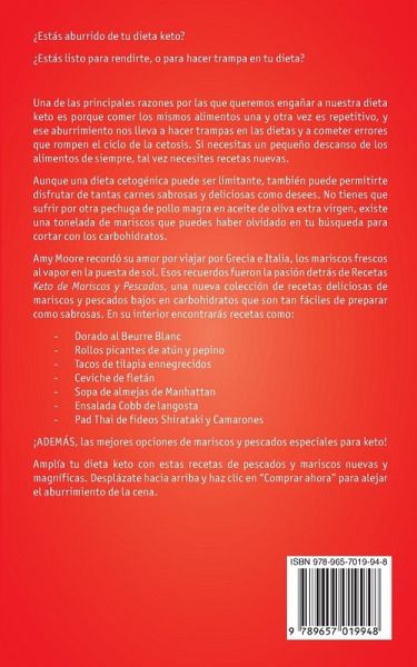 ¿Estás aburrido de tu dieta keto? ¿Estás listo para rendirte,o para hacer trampa en tu dieta? Una de las principales razones por las que queremos engañar a nuestra dieta keto es porque comer los mismos alimentos una y otra vez es repetitivo, y ese aburrimiento nos lleva a hacer trampas en las dietas y a cometer errores que rompen el ciclo de la cetosis. Si necesitas un pequeño descanso de los alimentos de siempre, tal vez necesites recetas nuevas.Aunque una dieta cetogénica puede ser limitante, también puede permitirte disfrutar de tantas carnes sabrosas y deliciosas como desees. No tienes que sufrir por otra pechuga de pollo magra en aceite de oliva extra virgen, existe una tonelada de mariscos que puedes haber olvidado en tu búsqueda para cortar con los carbohidratos.Amy Moore recordó su amor por viajar por Grecia e Italia, los mariscos frescos al vapor en la puesta de sol. Esos recuerdos fueron la pasión detrás de Recetas Keto de Mariscos y Pescados, una nueva colección de recetas deliciosas de mariscos y pescados bajos en carbohidratos que son tan fáciles de preparar como sabrosas. En su interior encontrarás recetas como: Dorado al Beurre Blanc Rollos picantes de atún y pepino Tacos de tilapia ennegrecidos Ceviche de fletán Sopa de almejas de Manhattan Ensalada Cobb de langosta Pad Thai de fideos Shirataki y Camarones ¡ADEMÁS, las mejores opciones de mariscos y pescados especiales para keto! Amplía tu dieta keto con estas recetas de pescados y mariscos nuevas y magníficas. Desplázate hacia arriba y haz clic en "Comprar ahora" para alejar el aburrimiento de la cena.