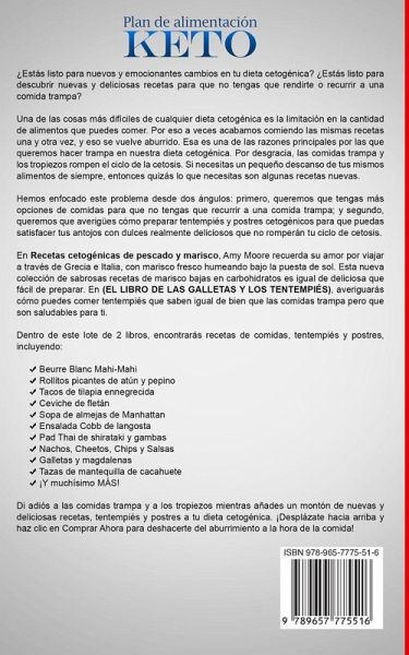 ¿Estás listo para nuevos y emocionantes cambios en tu dieta cetogénica? ¿Estás listo para descubrir nuevas y deliciosas recetas para que no tengas que rendirte o recurrir a una comida trampa? Una de las cosas más difíciles de cualquier dieta cetogénica es la limitación en la cantidad de alimentos que puedes comer. Por eso a veces acabamos comiendo las mismas recetas una y otra vez, y eso se vuelve aburrido. Esa es una de las razones principales por las que queremos hacer trampa en nuestra dieta cetogénica. Por desgracia, las comidas trampa y los tropiezos rompen el ciclo de la cetosis. Si necesitas un pequeño descanso de tus mismos alimentos de siempre, entonces quizás lo que necesitas son algunas recetas nuevas. Hemos enfocado este problema desde dos ángulos: primero, queremos que tengas más opciones de comidas para que no tengas que recurrir a una comida trampa; y segundo, queremos que averigües cómo preparar tentempiés y postres cetogénicos para que puedas satisfacer tus antojos con dulces realmente deliciosos que no romperán tu ciclo de cetosis. En Recetas cetogénicas de pescado y marisco, Amy Moore recuerda su amor por viajar a través de Grecia e Italia, con marisco fresco humeando bajo la puesta de sol. Esta nueva colección de sabrosas recetas de marisco bajas en carbohidratos es igual de deliciosa que fácil de preparar. En (EL LIBRO DE LAS GALLETAS Y LOS TENTEMPIÉS), averiguarás cómo puedes comer tentempiés que saben igual de bien que las comidas trampa pero que son saludables para ti. Dentro de este lote de 2 libros, encontrarás recetas de comidas, tentempiés y postres, incluyendo: Beurre Blanc Mahi-Mahi Rollitos picantes de atún y pepino Tacos de tilapia ennegrecida Ceviche de fletán Sopa de almejas de Manhattan Ensalada Cobb de langosta Pad Thai de shirataki y gambas Nachos, Cheetos, Chips y Salsas Galletas y magdalenas Tazas de mantequilla de cacahuete ¡Y muchísimo MÁS! Di adiós a las comidas trampa y a los tropiezos mientras añades un montón de nuevas y deliciosas recetas, tentempiés y postres a tu dieta cetogénica. ¡Desplázate hacia arriba y haz clic en Comprar Ahora para deshacerte del aburrimiento a la hora de la comida!