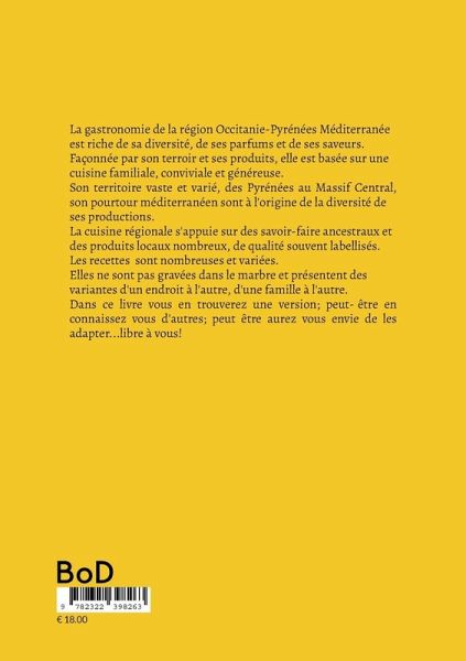 La gastronomie de la région Occitanie-Pyrénées Méditerranée est riche de sa diversité, de ses parfums et de ses saveurs.Façonnée par son terroir et ses produits, elle est basée sur une cuisine familiale, conviviale et généreuse.Son territoire vaste et varié, des Pyrénées au Massif Central, son pourtour méditerranéen sont à l'origine de la diversité de ses productions.La cuisine régionale s'appuie sur des savoir-faire ancestraux et des produits locaux nombreux, de qualité souvent labellisés.Les recettes sont nombreuses et variées. Elles ne sont pas gravées dans le marbre et présentent des variantes d'un endroit à l'autre, d'une famille à l'autre.Dans ce livre vous en trouverez une version; peut-être en connaissez vous d'autres; peut être aurez vous envie de les adapter...libre à vous!