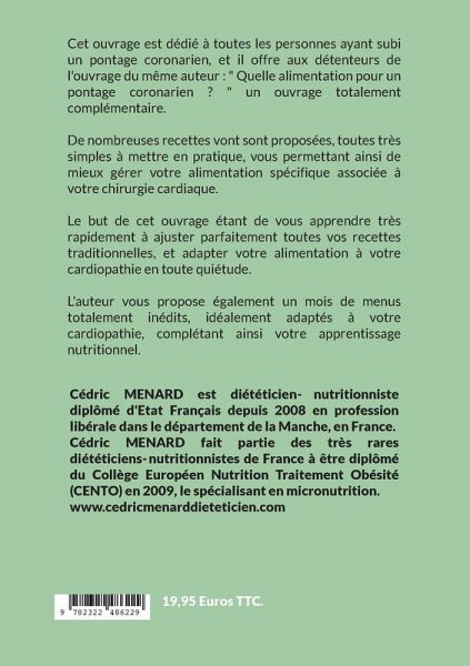 Cet ouvrage est dédié à toutes les personnes ayant subi un pontage coronarien, et il offre aux détenteurs de l'ouvrage du même auteur : " Quelle alimentation pour un pontage coronarien ? " un ouvrage totalement complémentaire.De nombreuses recettes vont sont proposées, toutes très simples à mettre en pratique, vous permettant ainsi de mieux gérer votre alimentation spécifique associée à votre chirurgie cardiaque.Le but de cet ouvrage étant de vous apprendre très rapidement à ajuster parfaitement toutes vos recettes traditionnelles, et adapter votre alimentation à votre cardiopathie en toute quiétude.L'auteur vous propose également un mois de menus totalement inédits, idéalement adaptés à votre cardiopathie, complétant ainsi votre apprentissage nutritionnel.