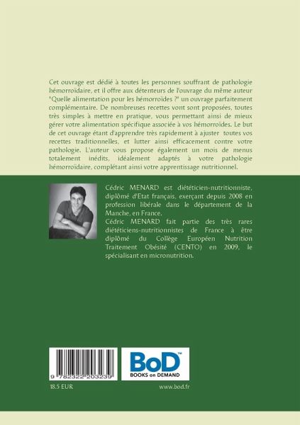 Cet ouvrage est dédié à toutes les personnes souffrant de pathologie hémorroïdaire, et il offre aux détenteurs de l'ouvrage du même auteur : " Quelle alimentation pour les hémorroïdes ? " un ouvrage totalement complémentaire.De nombreuses recettes vont sont proposées, toutes très simples à mettre en pratique, vous permettant ainsi de mieux gérer votre alimentation spécifique associée à vos hémorroïdes.Le but de cet ouvrage étant d'apprendre très rapidement à ajuster parfaitement toutes vos recettes traditionnelles, et lutter ainsi efficacement contre votre pathologie en toute quiétude.L'auteur vous propose également un mois de menus totalement inédits, idéalement adaptés à votre pathologie hémorroïdaire, complétant ainsi votre apprentissage nutritionnel.