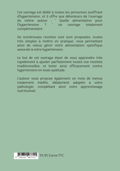 Cet ouvrage est dédié à toutes les personnes souffrant d'hypertension, et il offre aux détenteurs de l'ouvrage du même auteur : " Quelle alimentation pour l'hypertension ? " un ouvrage totalement complémentaire.De nombreuses recettes vont sont proposées, toutes très simples à mettre en pratique, vous permettant ainsi de mieux gérer votre alimentation spécifique associée à votre hypertension.Le but de cet ouvrage étant de vous apprendre très rapidement à ajuster parfaitement toutes vos recettes traditionnelles, et lutter ainsi efficacement contre hypertension en toute quiétude.L'auteur vous propose également un mois de menus totalement inédits, idéalement adaptés à votre pathologie, complétant ainsi votre apprentissage nutritionnel.
