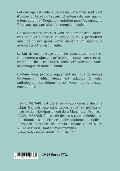 Cet ouvrage est dédié à toutes les personnes souffrant d'oesophagite, et il offre aux détenteurs de l'ouvrage du même auteur : " Quelle alimentation pour l'oesophagite ? " un ouvrage parfaitement complémentaire.De nombreuses recettes vont sont proposées, toutes très simples à mettre en pratique, vous permettant ainsi de mieux gérer votre alimentation spécifique associée à votre oesophagite.Le but de cet ouvrage étant de vous apprendre très rapidement à ajuster parfaitement toutes vos recettes traditionnelles, et traiter ainsi efficacement votre oesophagite en toute quiétude.L'auteur vous propose également un mois de menus totalement inédits, idéalement adaptés à votre pathologie, complétant ainsi votre apprentissage nutritionnel.