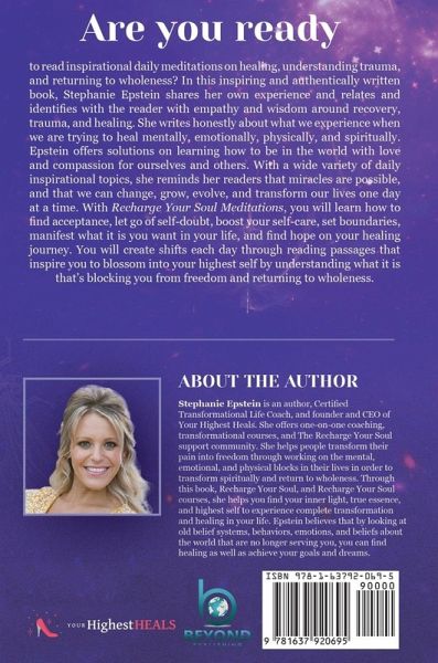 Are you ready to read inspirational daily meditations on healing, understanding trauma, and returning to wholeness? In this inspiring and authentically written book, Stephanie Epstein shares her own experience and relates and identifies with the reader with empathy and wisdom around recovery, trauma, and healing. She writes honestly about what we experience when we are trying to heal mentally, emotionally, physically, and spiritually. Epstein offers solutions on learning how to be in the world with love and compassion for ourselves and others. With a wide variety of daily inspirational topics, she reminds her readers that miracles are possible and that we can change, grow, evolve, and transform our lives one day at a time. With Recharge Your Soul Meditations, you will learn how to find acceptance, let go of self-doubt, boost your self-care, set boundaries, manifest what it is you want in your life, and find hope on your healing journey. You will create shifts each day through reading passages that inspire you to blossom into your highest self by understanding what it is that's blocking you from freedom and returning to wholeness. Stephanie Epstein is an author, Certified Transformational Life Coach, and founder and CEO of Your Highest Heals. She offers one-on-one coaching, transformational courses, and The Recharge Your Soul support community. She helps people transform their pain into freedom through working on the mental, emotional, and physical blocks in their lives in order to transform spiritually and return to wholeness. Through this book, Recharge Your Soul, and Recharge Your Soul courses, she helps you find your inner light, true essence, and highest self to experience complete transformation and healing in your life. Epstein believes that by looking at old belief systems, behaviors, emotions, and beliefs about the world that are no longer serving you, you can find healing as well as achieve your goals and dreams.