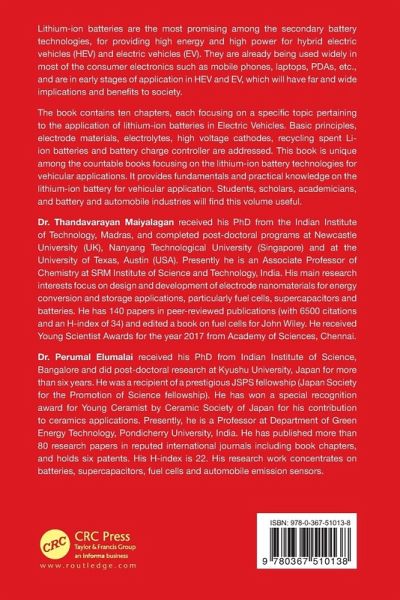 The book contains ten chapters, each focusing on a specific topic pertaining to the application of lithium-ion batteries in Electric Vehicles. Basic principles, electrode materials, electrolytes, high voltage cathodes, recycling spent Li-ion batteries and battery charge controller are addressed.