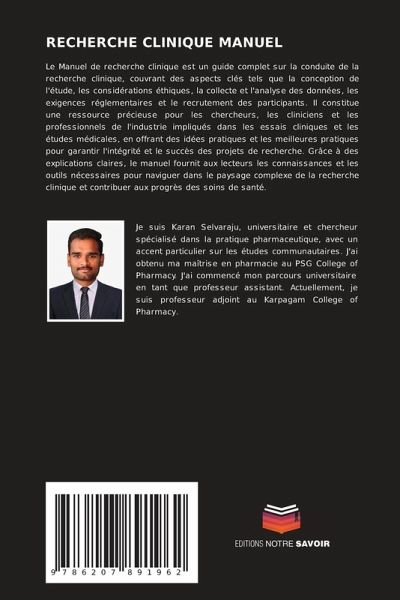 Le Manuel de recherche clinique est un guide complet sur la conduite de la recherche clinique, couvrant des aspects clés tels que la conception de l'étude, les considérations éthiques, la collecte et l'analyse des données, les exigences réglementaires et le recrutement des participants. Il constitue une ressource précieuse pour les chercheurs, les cliniciens et les professionnels de l'industrie impliqués dans les essais cliniques et les études médicales, en offrant des idées pratiques et les meilleures pratiques pour garantir l'intégrité et le succès des projets de recherche. Grâce à des explications claires, le manuel fournit aux lecteurs les connaissances et les outils nécessaires pour naviguer dans le paysage complexe de la recherche clinique et contribuer aux progrès des soins de santé.
