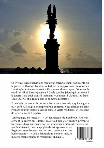 Ce livre est un recueil de faits complet et soigneusement documenté sur la guerre en Ukraine. L'auteur ne fait pas de suppositions personnelles. Les simples événements sont suffisamment dramatiques. Comment le conflit est-il né historiquement ? Quels sont les jalons qui ont mené à la guerre ? De quoi s'agit-il vraiment ? Comment l'Ukraine, les États-Unis, l'OTAN et la Russie ont-ils alimenté l'escalade. Il ne s'agit pas de savoir qui est « bon » ou « mauvais », qui « gagne » ou « perd ». Il s'agit de comprendre le contexte. Nous élargissons ainsi l'espace pour un dialogue vers la paix. La vérité rend libre. Et le respect de la vérité mène à la paix. Témoignages de lecteurs : « Je connaissais de nombreux faits concernant la guerre en Ukraine, mais tout cela était jusqu'à présent si fragmenté dans ma conscience, de nombreuses pièces de puzzle éparses. Maintenant, une image globale est apparue ». - « Regarder attentivement ce qui s'est passé a été très bouleversant ». - « Cela a fait quelque chose en moi. Je me sens maintenant plus réconciliée, en paix ».