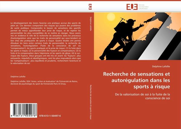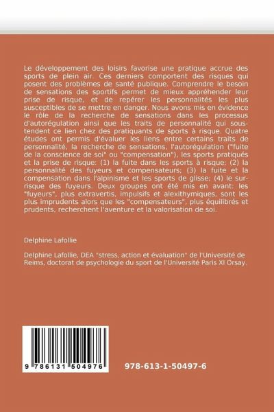 Le développement des loisirs favorise une pratique accrue des sports de plein air. Ces derniers comportent des risques qui posent des problèmes de santé publique. Comprendre le besoin de sensations des sportifs permet de mieux appréhender leur prise de risque, et de repérer les personnalités les plus susceptibles de se mettre en danger. Nous avons mis en évidence le rôle de la recherche de sensations dans les processus d''autorégulation ainsi que les traits de personnalité qui sous-tendent ce lien chez des pratiquants de sports à risque. Quatre études ont permis d''évaluer les liens entre certains traits de personnalité, la recherche de sensations, l''autorégulation ("fuite de la conscience de soi" ou "compensation"), les sports pratiqués et la prise de risque: (1) la fuite dans les sports à risque; (2) la personnalité des fuyeurs et compensateurs; (3) la fuite et la compensation dans l''alpinisme et les sports de glisse; (4) le sur-risque des fuyeurs. Deux groupes ont été mis en avant: les "fuyeurs", plus extravertis, impulsifs et alexithymiques, sont les plus imprudents alors que les "compensateurs", plus équilibrés et prudents, recherchent l''aventure et la valorisation de soi.