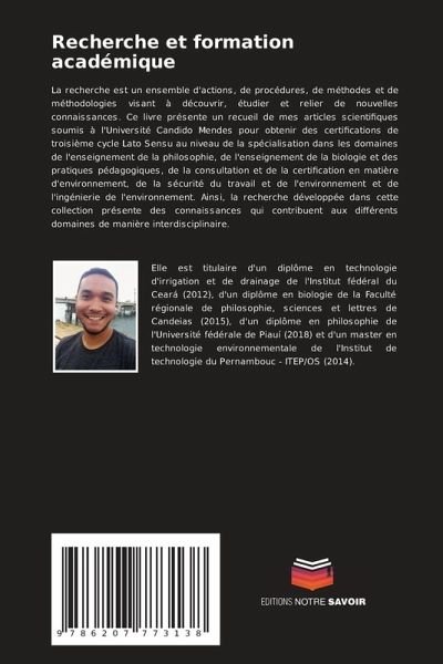 La recherche est un ensemble d'actions, de procédures, de méthodes et de méthodologies visant à découvrir, étudier et relier de nouvelles connaissances. Ce livre présente un recueil de mes articles scientifiques soumis à l'Université Candido Mendes pour obtenir des certifications de troisième cycle Lato Sensu au niveau de la spécialisation dans les domaines de l'enseignement de la philosophie, de l'enseignement de la biologie et des pratiques pédagogiques, de la consultation et de la certification en matière d'environnement, de la sécurité du travail et de l'environnement et de l'ingénierie de l'environnement. Ainsi, la recherche développée dans cette collection présente des connaissances qui contribuent aux différents domaines de manière interdisciplinaire.