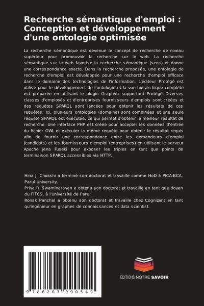 La recherche sémantique est devenue le concept de recherche de niveau supérieur pour promouvoir la recherche sur le web. La recherche sémantique sur le web favorise la recherche sémantique (sens) et donne une correspondance exacte. Dans la recherche proposée, une ontologie de recherche d'emploi est développée pour une recherche d'emploi efficace dans le domaine des technologies de l'information. L'éditeur Protégé est utilisé pour le développement de l'ontologie et la vue hiérarchique complète est préparée en utilisant le plugin GraphViz supportant Protégé. Diverses classes d'employés et d'entreprises fournisseurs d'emplois sont créées et des requêtes SPARQL sont lancées pour obtenir les résultats de ces requêtes. Ici, plusieurs ontologies (domaine) sont combinées et une seule requête SPARQL est exécutée, ce qui permet d'obtenir le meilleur résultat de recherche. Une interface PHP est créée pour accepter les données d'entrée du fichier OWL et exécuter la même requête pour obtenir le résultat requis afin de fournir une correspondance entre les demandeurs d'emploi (candidats) et les fournisseurs d'emploi (entreprises) en utilisant le serveur Apache Jena Fuseki pour exposer les triples en tant que points de terminaison SPARQL accessibles via HTTP.