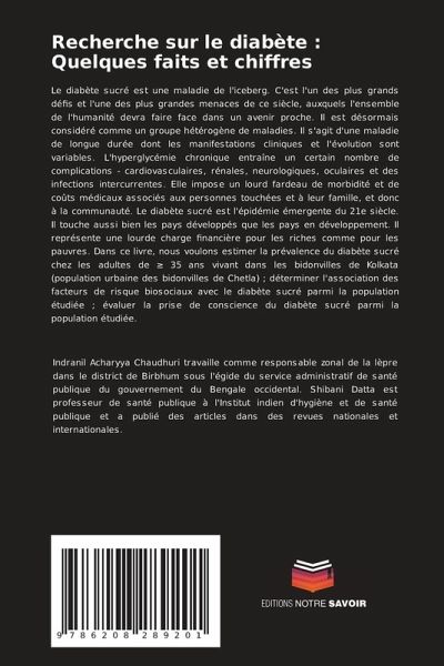 Le diabète sucré est une maladie de l'iceberg. C'est l'un des plus grands défis et l'une des plus grandes menaces de ce siècle, auxquels l'ensemble de l'humanité devra faire face dans un avenir proche. Il est désormais considéré comme un groupe hétérogène de maladies. Il s'agit d'une maladie de longue durée dont les manifestations cliniques et l'évolution sont variables. L'hyperglycémie chronique entraîne un certain nombre de complications - cardiovasculaires, rénales, neurologiques, oculaires et des infections intercurrentes. Elle impose un lourd fardeau de morbidité et de coûts médicaux associés aux personnes touchées et à leur famille, et donc à la communauté. Le diabète sucré est l'épidémie émergente du 21e siècle. Il touche aussi bien les pays développés que les pays en développement. Il représente une lourde charge financière pour les riches comme pour les pauvres. Dans ce livre, nous voulons estimer la prévalence du diabète sucré chez les adultes de 35 ans vivant dans les bidonvilles de Kolkata (population urbaine des bidonvilles de Chetla) ; déterminer l'association des facteurs de risque biosociaux avec le diabète sucré parmi la population étudiée ; évaluer la prise de conscience du diabète sucré parmi la population étudiée.