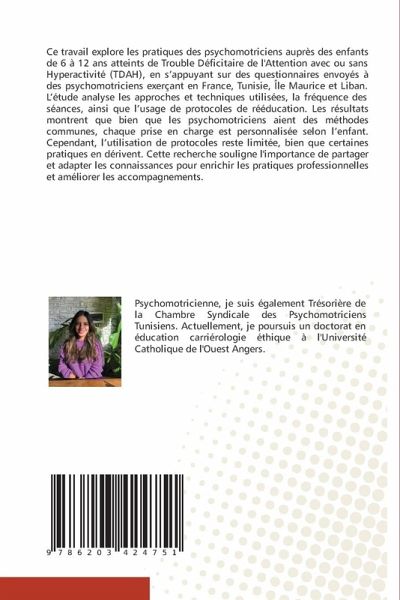 Ce travail explore les pratiques des psychomotriciens auprès des enfants de 6 à 12 ans atteints de Trouble Déficitaire de l'Attention avec ou sans Hyperactivité (TDAH), en s'appuyant sur des questionnaires envoyés à des psychomotriciens exerçant en France, Tunisie, Île Maurice et Liban. L'étude analyse les approches et techniques utilisées, la fréquence des séances, ainsi que l'usage de protocoles de rééducation. Les résultats montrent que bien que les psychomotriciens aient des méthodes communes, chaque prise en charge est personnalisée selon l'enfant. Cependant, l'utilisation de protocoles reste limitée, bien que certaines pratiques en dérivent. Cette recherche souligne l'importance de partager et adapter les connaissances pour enrichir les pratiques professionnelles et améliorer les accompagnements.