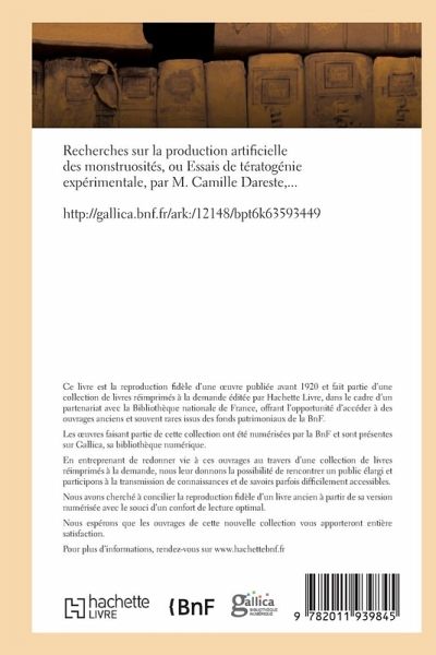 Recherches sur la production artificielle des monstruosités, ou Essais de tératogénie expérimentale, par M. Camille Dareste, ... Date de l'édition originale: 1891 Le présent ouvrage s'inscrit dans une politique de conservation patrimoniale des ouvrages de la littérature Française mise en place avec la BNF. HACHETTE LIVRE et la BNF proposent ainsi un catalogue de titres indisponibles, la BNF ayant numérisé ces oeuvres et HACHETTE LIVRE les imprimant à la demande. Certains de ces ouvrages reflètent des courants de pensée caractéristiques de leur époque, mais qui seraient aujourd'hui jugés condamnables. Ils n'en appartiennent pas moins à l'histoire des idées en France et sont susceptibles de présenter un intérêt scientifique ou historique. Le sens de notre démarche éditoriale consiste ainsi à permettre l'accès à ces oeuvres sans pour autant que nous en cautionnions en aucune façon le contenu. Pour plus d'informations, rendez-vous sur www.hachettebnf.fr