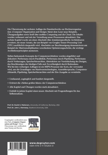 Die Übersetzung der sechsten Auflage des Standardwerks zur Rechnerorganisation »Computer Organization and Design« bietet dem Leser neue Beispiele, Übungsaufgaben sowie Stoff über mobiles Computing und die Cloud. Die Inhalte wurden verbessert und mit der Vorstellung neuer Prozessoren aktualisiert. Das sechste Kapitel wurde um einen Abschnitt über domänenspezifische Architekturen erweitert, ein neuer Ansatz, der am Beispiel von Googles Tensor Processing Unit (TPU) ausführlich dargestellt wird. Abschnitte zur Beschleunigung demonstrieren am Beispiel der Matrixmultiplikation verschiedene Optimierungsschritte, die wichtige Architekturprinzipien ausnutzen.
