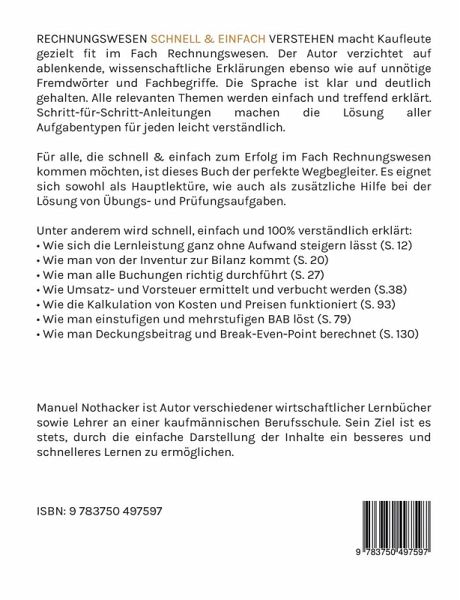 RECHNUNGSWESEN SCHNELL & EINFACH VERSTEHEN macht Kaufleute gezielt fit im Fach Rechnungswesen. Der Autor verzichtet auf ablenkende, wissenschaftliche Erklärungen ebenso wie auf unnötige Fremdwörter und Fachbegriffe. Die Sprache ist klar und deutlich gehalten. Alle relevanten Themen werden einfach und treffend erklärt. Schritt-für-Schritt-Anleitungen machen die Lösung aller Aufgabentypen für jeden leicht verständlich. Für alle, die schnell & einfach zum Erfolg im Fach Rechnungswesen kommen möchten, ist dieses Buch der perfekte Wegbegleiter. Es eignet sich sowohl als Hauptlektüre, wie auch als zusätzliche Hilfe bei der Lösung von Übungs- und Prüfungsaufgaben.Unter anderem wird schnell, einfach und 100% verständlich erklärt: - Wie sich die Lernleistung ganz ohne Aufwand steigern lässt (S. 12)- Wie man von der Inventur zur Bilanz kommt (S. 20)- Wie man alle Buchungen richtig durchführt (S. 27)- Wie Umsatz- und Vorsteuer ermittelt und verbucht werden (S.38)- Wie die Kalkulation von Kosten und Preisen funktioniert (S. 93)- Wie man einstufigen und mehrstufigen BAB löst (S. 79)- Wie man Deckungsbeitrag und Break-Even-Point berechnet (S. 130)