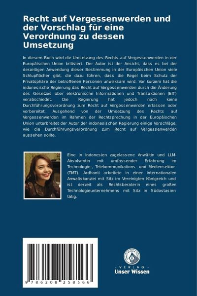 In diesem Buch wird die Umsetzung des Rechts auf Vergessenwerden in der Europäischen Union kritisiert. Der Autor ist der Ansicht, dass es bei der derzeitigen Anwendung dieser Bestimmung in der Europäischen Union viele Schlupflöcher gibt, die dazu führen, dass die Regel beim Schutz der Privatsphäre der betroffenen Personen unwirksam wird. Vor kurzem hat die indonesische Regierung das Recht auf Vergessenwerden durch die Änderung des Gesetzes über elektronische Informationen und Transaktionen (EIT) verabschiedet. Die Regierung hat jedoch noch keine Durchführungsverordnung zum Recht auf Vergessenwerden erlassen oder vorbereitet. Ausgehend von der Umsetzung des Rechts auf Vergessenwerden im Rahmen der Rechtsprechung in der Europäischen Union unterbreitet der Autor der indonesischen Regierung einige Vorschläge, wie die Durchführungsverordnung zum Recht auf Vergessenwerden aussehen sollte.