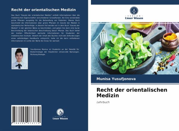 Das Buch "Gesetz der orientalischen Medizin" enthält Informationen über die medizinischen Eigenschaften verschiedener Grünpflanzen. Ibn Sino verwendete grüne Pflanzen ausgiebig für die Behandlung von Patienten. Dieses Buch beschreibt die Informationen über grüne Pflanzen im Gesetz der Medizin in alphabetischer Reihenfolge. In diesem Fall werden wir in dem Buch "Gesetz der Medizin" in der gleichen Weise zu beschreiben, und geben Sie dann eine kurze Beschreibung der botanischen Beschreibung dieser Pflanze. Das Buch bietet der breiten Öffentlichkeit wertvolle Informationen für Studenten der medizinischen Institute. Obwohl der Inhalt des Buches nicht den Anforderungen eines vollständigen Handbuchs entspricht, halte ich die darin enthaltenen Informationen im Lichte der Worte Ibn Sinas für wertvoll.