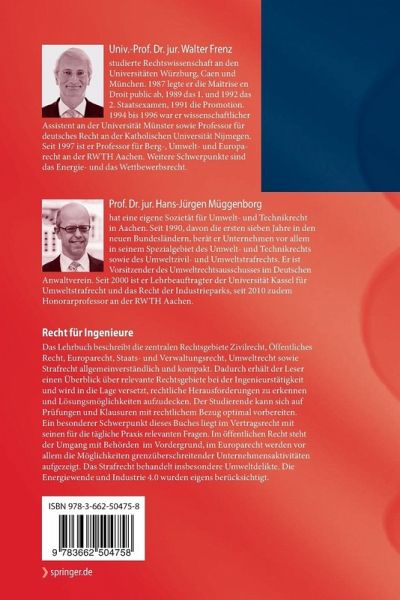 Das Lehrbuch beschreibt die zentralen Rechtsgebiete Zivilrecht, Öffentliches Recht, Europarecht, Staats- und Verwaltungsrecht, Umweltrecht sowie Strafrecht allgemeinverständlich und kompakt. Dadurch erhält der Leser einen Überblick über relevante Rechtsgebiete bei der Ingenieurstätigkeit und wird in die Lage versetzt, rechtliche Herausforderungen zu erkennen und Lösungsmöglichkeiten aufzudecken. Der Studierende kann sich auf Prüfungen und Klausuren mit rechtlichem Bezug optimal vorbereiten. Ein besonderer Schwerpunkt dieses Buches liegt im Vertragsrecht mit seinen für die tägliche Praxis relevanten Fragen. Im öffentlichen Recht steht der Umgang mit Behörden im Vordergrund, im Europarecht werden vor allem die Möglichkeiten grenzüberschreitender Unternehmensaktivitäten aufgezeigt. Das Strafrecht behandelt insbesondere Umweltdelikte. Die Energiewende und Industrie 4.0 wurden eigens berücksichtigt.