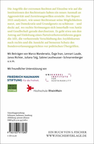 Nele Austermann, geb. 1988, ist wissenschaftliche Mitarbeiterin am Zentrum für Europäische Rechtspolitik der Universität Bremen und Vorstandsmitglied des Vereins Demokratischer Juristinnen und Juristen. Sie promoviert zum Thema 'Europäisches Migrationsmanagement'. Leonard Ihßen, geb. 1996, arbeitet als Journalist und für die Gesetzeskampagne 'Freiheitsfonds', die Menschen aus dem Gefängnis freikauft, wenn sie wegen Fahren ohne Ticket einsitzen. Für den Report 'Recht gegen rechts' ist er unter anderem als Social Media-Redakteur tätig. Er lebt in Berlin. Heike Kleffner, geb. 1966, ist freie Journalistin und Geschäftsführerin des Bundesverbandes der Beratungsstellen für Opfer rechter, rassistischer und antisemitischer Gewalt. Seit den 1990er Jahren publiziert sie über Rechtsextremismus, zuletzt erschienen von ihr, gemeinsam mit Matthias Meisner herausgegeben, die Bücher 'Extreme Sicherheit: Rechtsradikale in Polizei, Verfassungsschutz, Bundeswehr und Justiz' sowie 'Unter Sachsen. Zwischen Wut und Willkommen'. Kati Lang, geb. 1979, vertritt als Rechtsanwältin Betroffene von rechten, rassistischen und antisemitischen Gewalttaten, u. a. im Verfahren gegen die rechtsterroristische 'Gruppe Freital' sowie in Verfahren anlässlich des Rohrbombenanschlags auf die Dresdner Moschee und des antisemitischen Attentats von Halle. Sie hat zum Umgang der Justiz mit vorurteilsmotivierter Gewalt promoviert. Maximilian Pichl, geb. 1987, hat Rechtswissenschaft und Politikwissenschaft studiert. Er forscht an der Universität Kassel und der Goethe-Universität Frankfurt am Main. Ronen Steinke, geb. 1983, ist Jurist, Autor und Redakteur der Süddeutschen Zeitung. Zuletzt erschien im Berlin Verlag sein Buch 'Vor dem Gesetz sind nicht alle gleich. Die neue Klassenjustiz'. Tore Vetter, geb. 1992, ist wissenschaftlicher Mitarbeiter am Zentrum für Europäische Rechtspolitik der Universität Bremen. Er promoviert zum Thema 'Eigenverfassung von Versammlungen'.